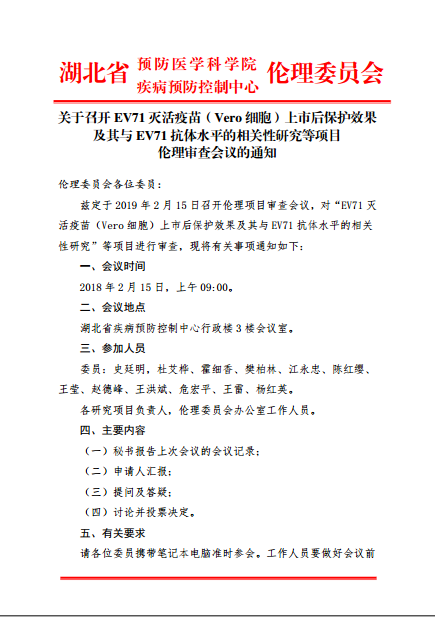 關(guān)于召開EV71滅活疫苗(Vero細胞)上市后保護效果及其與EV71抗體水平的相關(guān)性研究等項目倫理審查會議通知