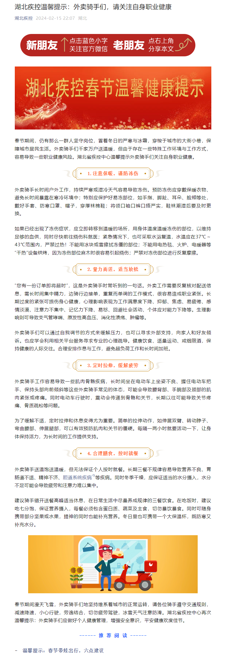 湖北疾控溫馨提示:外賣騎手們,請關注自身職業(yè)健康