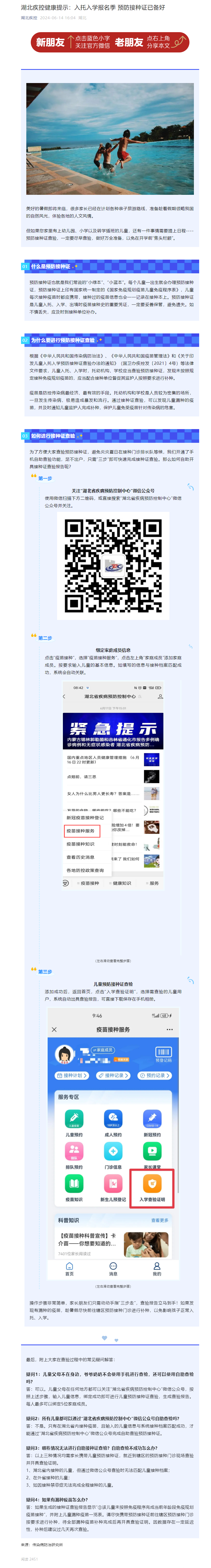 湖北疾控健康提示:入托入學報名季 預防接種證已備好