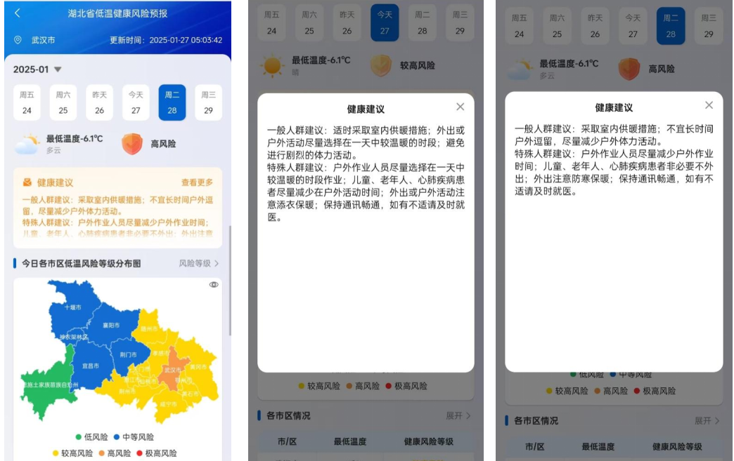 湖北省低溫寒潮健康風(fēng)險(xiǎn)預(yù)報(bào)為湖北省環(huán)境健康風(fēng)險(xiǎn)預(yù)報(bào)發(fā)布平臺(tái)三大功能之一,可展示我省當(dāng)日及未來2日的最低溫度,提示對(duì)應(yīng)的低溫健康風(fēng)險(xiǎn)等級(jí)和健康防護(hù)建議,其信息展示在空間尺度上可精確至17個(gè)地市州的每個(gè)區(qū)縣。對(duì)于不同的天氣情況,低溫健康風(fēng)險(xiǎn)等級(jí)共分為“低風(fēng)險(xiǎn)、中等風(fēng)險(xiǎn)、較高風(fēng)險(xiǎn)、高風(fēng)險(xiǎn)、極高風(fēng)險(xiǎn)”5個(gè)等級(jí),每個(gè)等級(jí)所匹配的健康防護(hù)建議可以幫助公眾提前做好應(yīng)對(duì)和健康防護(hù),達(dá)到降低健康損失的目的。該平臺(tái)自2024年12月17日正式上線以來,已連續(xù)發(fā)布低溫健康風(fēng)險(xiǎn)信息40余天,并將持續(xù)發(fā)布。
