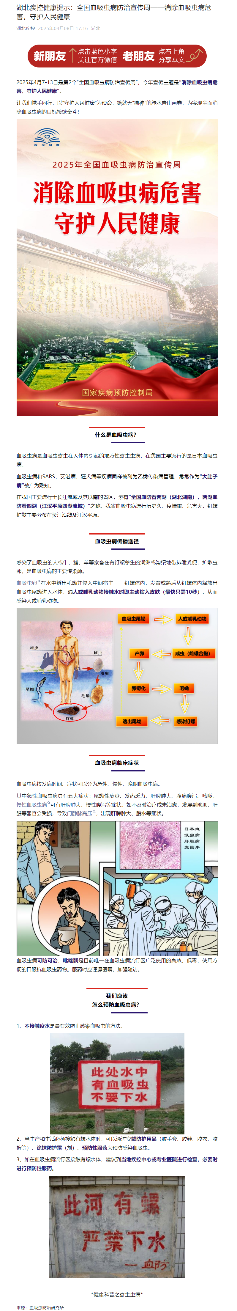 湖北疾控健康提示:全國血吸蟲病防治宣傳周——消除血吸蟲病危害,守護人民健康