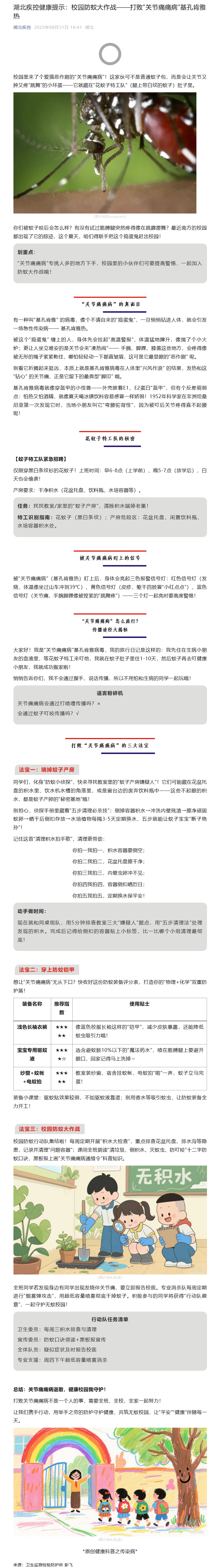 湖北疾控健康提示:校園防蚊大作戰——打敗“關節痛痛病”基孔肯雅熱