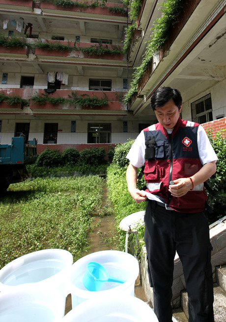 7月9日,接上級(jí)緊急命令,省疾控中心國(guó)家衛(wèi)生應(yīng)急隊(duì)迅速組織隊(duì)員10人,由占發(fā)先副院長(zhǎng)代領(lǐng),赴蔡甸區(qū)侏儒鎮(zhèn)第四中學(xué)消泗鄉(xiāng)災(zāi)民的安置點(diǎn),出動(dòng)消毒防疫車(chē)、水質(zhì)檢測(cè)車(chē)、通訊保障車(chē)和指揮車(chē)4臺(tái),與武漢市、蔡甸區(qū)疾控人員一起開(kāi)展了水質(zhì)檢測(cè)、環(huán)境消殺滅等工作,并開(kāi)展了防病知識(shí)宣傳。