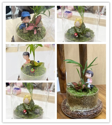 活動開始前,微景觀制作師首先介紹了制作所需的材料和制作技巧等知識,大家聽得聚精會神、躍躍欲試。簡單教學(xué)后,大家開始動手制作,依次把火山石、水苔、赤玉土、苔蘚、小擺件放入圓形玻璃瓶中。待種好綠植、將土壓實、鋪上苔蘚和松皮石,最后插上一個可愛的小擺件做裝飾,一件小小的“森林世界”就組成了。制作完成后,大家紛紛表示意猶未盡、回味無窮。