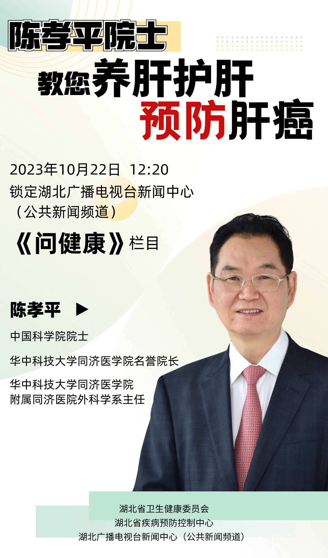 2023年10月8日,在湖北省疾病預防控制中心黨委書記朱洪波陪同下,中國科學院院士、華中科技大學同濟醫學院名譽院長、華中科技大學同濟醫學院附屬同濟醫院外科學系主任陳孝平,來到湖北廣播電視臺新聞中心,出鏡電視科普欄目《問健康》,為觀眾解讀肝癌、胰腺癌防治知識。