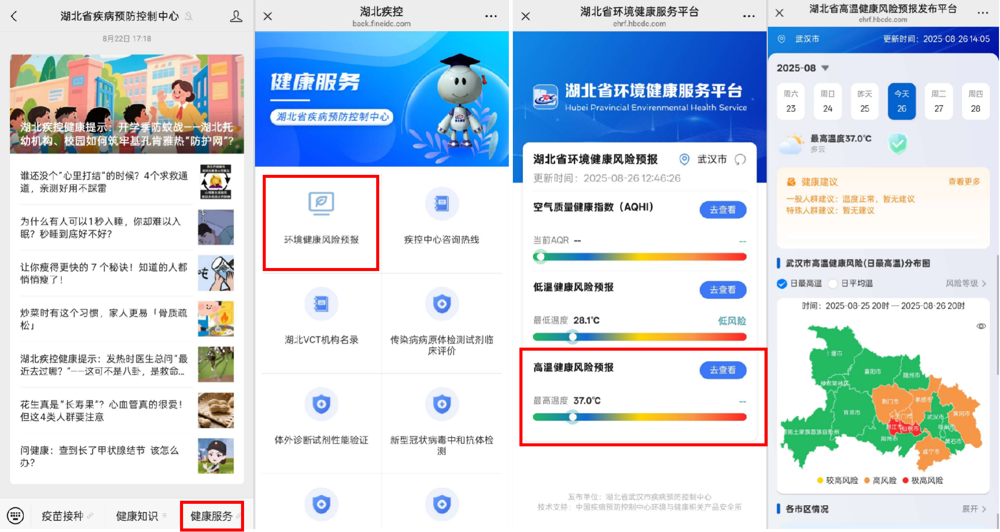 8月25日,湖北省衛生健康委員會、湖北省氣象局及湖北省疾病預防控制局三部門聯合發布了“高溫健康風險預警及健康提示”;與此同時,湖北省環境健康服務平臺高溫健康風險預報功能在湖北省疾病預防控制中心官方微信公眾號正式上線。